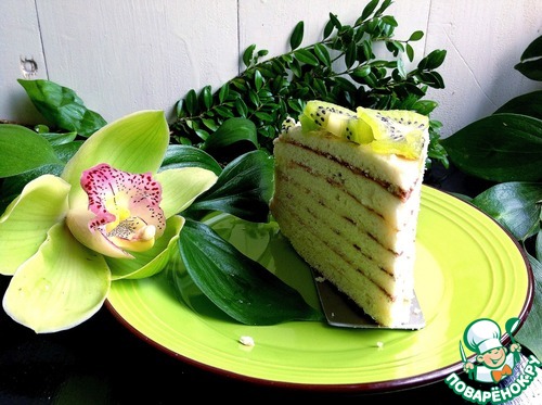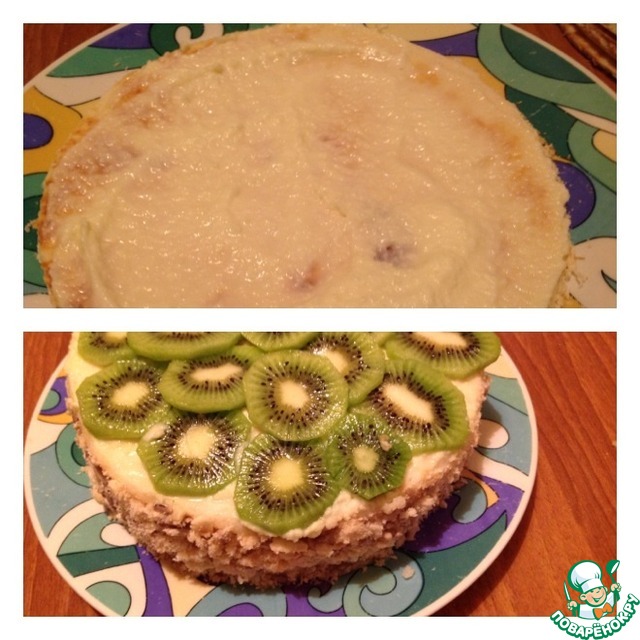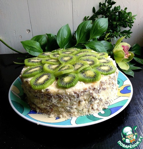 Так же обмазать бока торта кремом и обсыпать подготовленной крошкой с семечками. Киви очистить и нарезать кружочками, выложить на верх пирога. Отправить торт в холодильник на ночь, чтобы пропитался кремом.