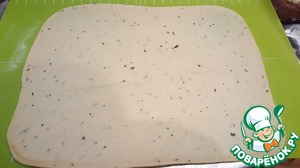 Готовое тесто достаём из х/п, делим на 2 части. Затем раскатываем первую часть прямоугольником.