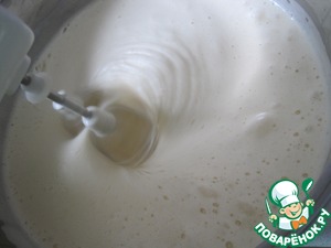 Он сильными крепкими руками взбивает яйца с сахаром до увеличения в объеме в 2, 5 раза.