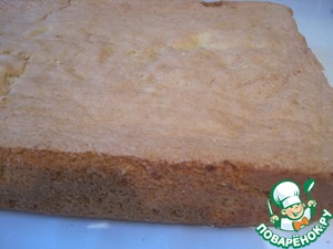 Готовый бисквит Он разрезал пополам, пропитал сиропом (Сахар с водой кипятим 1-2 мин, охлаждаем, добавляем коньяк)