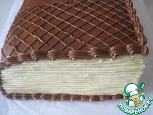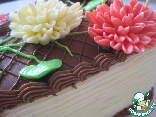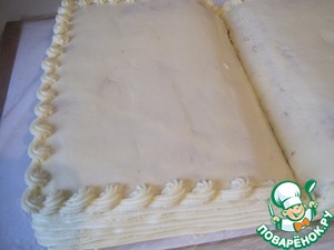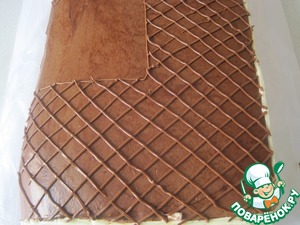 Бисквит положили друг на друга прослаивая кремом. Поверхность и одну сторону Она покрыла шоколадным кремом (в масляный крем добавляем какао-порошок).