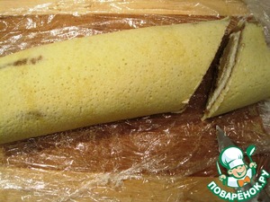 Помогая себе бумагой, в которую был завёрнут бисквит, аккуратно сворачиваем бисквит с кремом в рулет, одновременно избавляясь от этой бумаги. Получившийся рулет плотно оборачиваем пищевой плёнкой и убираем в холодильник на 1-2 часа до полного остывания и застывания крема. -