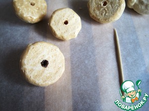 Сформируем грибочки: для этого на паровой бане растопим небольшое количество тёмного шоколада. В безе (форма шляпки) зубочисткой проделаем отверстие и наденем её на другое безе (форма ножки).