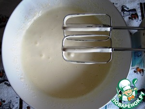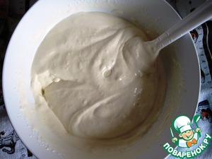 В яичную массу просеиваем муку с разрыхлителем и вымешиваем лопаточкой движениями "снизу вверх" до получения однородного текучего бисквитного теста.