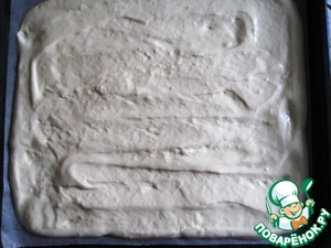 Бисквитное тесто перекладываем на подготовленный противень, разравниваем. Ставим в разогретую духовку и выпекаем 10-12 минут или до готовности. Важно не пересушить бисквит!