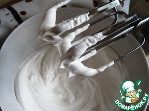 На маленькой скорости миксера начинаем взбивать белки со щепоткой соли. Как только белки начнут пениться, прибавляем скорость миксера до максимума и, постепенно добавляя сахар, взобьём белки до глянцевой массы с устойчивыми пиками. -