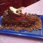 И так, выкладываем рулет на поднос, сверху небольшое количество ганаша "приклеиваем" срезанный наискосок кусочек-"пенёк". -