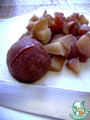 Сливу, чуть разморозив, нарезать кубиками. Крупную клюкву нарезать на четвертинки, мелкую-пополам.