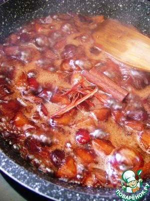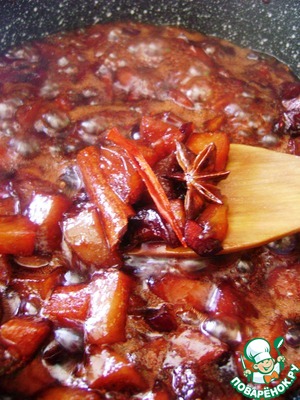 При желании добавить немного перца чили –я положила несколько сушеных полосочек. Влить вино и выпарить его почти полностью, постоянно помешивая. Слива должна стать полупрозрачной и достаточно мягкой.