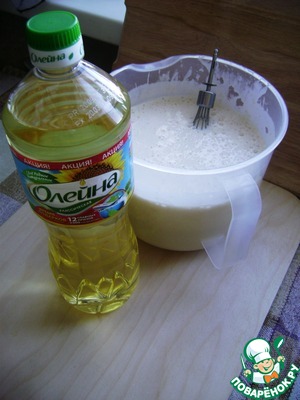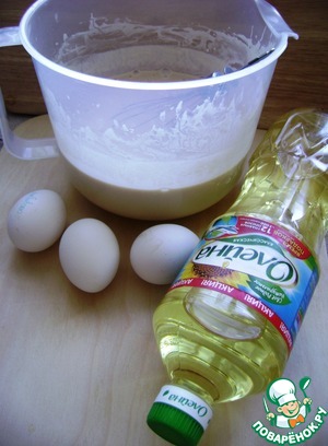 Яйца взбить с сахаром в пышную пену. Продолжая взбивать, тонкой струйкой влить 2 ложки масла «Олейна». Получившийся крем аккуратно смешать с тестом. Добавить щепотку соды, погашенной 50 мл кипятка и размешать тесто осторожно.