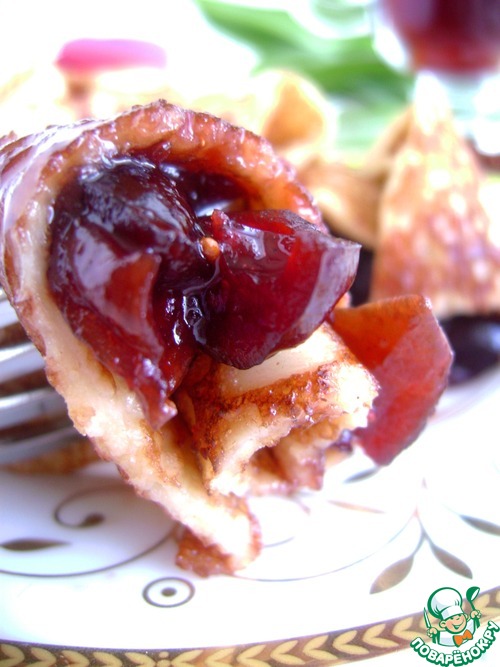Теплые блинчики начинить карамельной сливой, полить сливовым сиропом и подавать с чаем с пряностями.