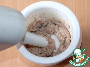 4. Приготовим начинку. Обжаренные кусочки печени кладем в чашу для блендера. Добавляем ветчину, порезанную кусочками и чеснок, пюрироваем.