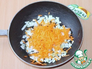 5. Мелко нарезанный лук обжариваем 1-2 минуту на растительном масле. Добавляем тертую на крупной терке морковь и тушим до прозрачности лука.