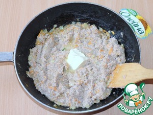 6. Затем выкладываем измельченную начинку, сливочное масло, солим, перчим, перемешиваем и тушим под крышкой 2-3 минуты.