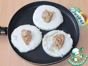 7. На хорошо разогретую сковороду выкладываем тесто для блинчиков (Ф 11 см). Кладем на блинчики начинку