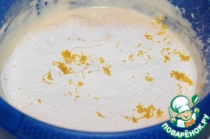 Муку просеять с разрыхлителем. Добавить в яичную массу. Сразу же добавить и цедру. Еще раз повторюсь, что если яйца хорошо взбиты, то мука очень хорошо держится на поверхности.