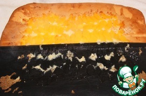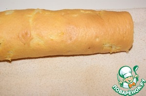 Перевернуть бисквит на полотенце начинкой вверх и с его помощью скрутить рулетом. Остудить.