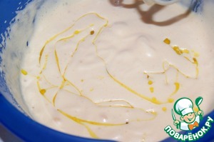 Не переставая взбивать ввести сахар и продолжать взбивать до его полного растворения. Тоненькой струйкой влить масло и взбить миксером на 1-й скорости.