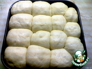 Форму для выпекания смазать растительным маслом, выложить туда готовые шарики и опять поставить в тёплое место где-то на час (форму прикрыть либо пищевой плёнкой, либо влажной салфеткой).