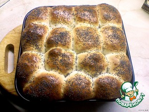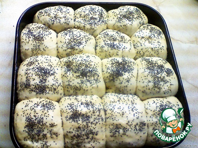 Через час смазать булочки взбитым яйцом с обавлением 1 ст.л. воды, посыпать маком и поставить в разогретую до 190 градусов духовку.