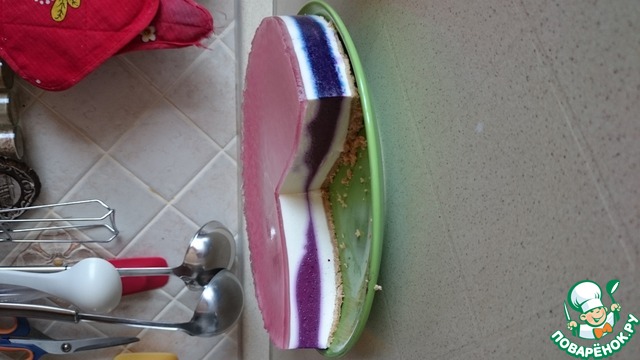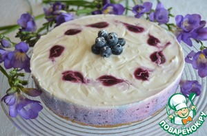 6. На слой печенья с маслом выложить ягодную смесь, поверх смесь с соком, а затем чистая кремовая масса. Можно украсить каплями черничного сока и убрать в холодильник до полного застывания.
