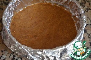 1. Масло растопить и смазать им дно и бока разъемной формы 23 см в диаметре (высота 7 см). Печенье и оставшееся растопленное масло положить в процессор и измельчить. Дно формы проложить кондитерской бумагой. На нее выложить смесь крошек печенья с маслом и разровнять, хорошенько придавливая. Это будет основа чизкейка.