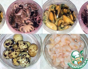 Маринованные маленькие осьминоги и мидии.
