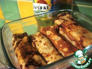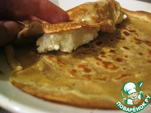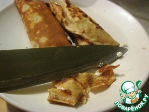Накладываем сырную начинку на блины, заворачиваем их в трубочки