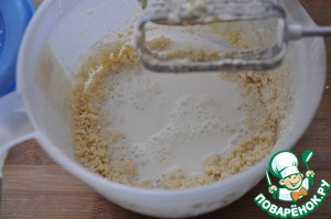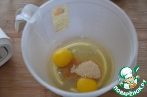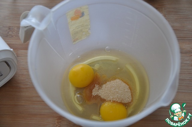 В глубокую посуду разбиваем яйца, кладём сахар и всё хорошо взбиваем в пену миксером.