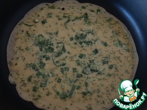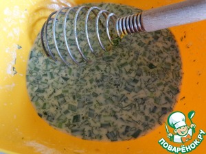 Зелень (лук, укроп, щавель) помыть, обсушить и мелко нарезать. Добавить в тесто.