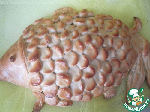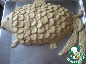 Порывали рыбу чешуйками из теста в виде кружочков.