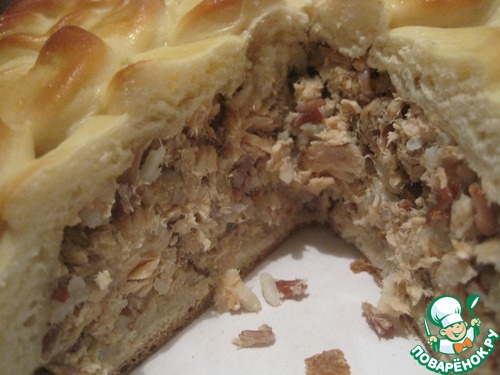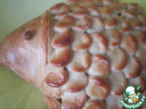 Дед положил рыбный фарш, баба подрезала тесто и сформовала голову рыбе.