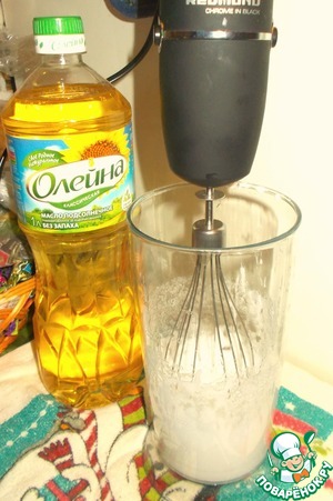 Приступаем к приготовлению начинки. Яичный белок сбиваем с сахаром при помощи блендера до образования пик.