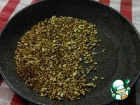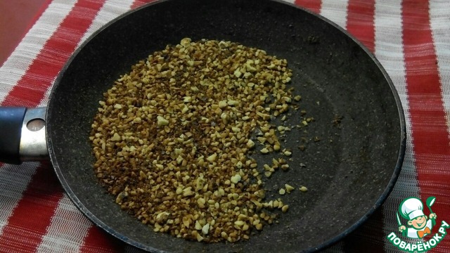 Рубим орех и обжариваем его на сковороде несколько минут. |