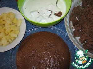 Выложить второй слой из бисквита и ананаса, сбрызнуть сиропом.