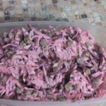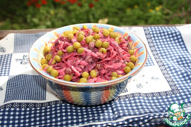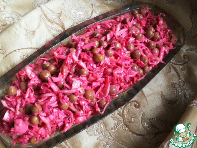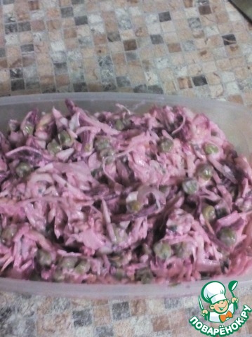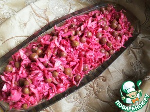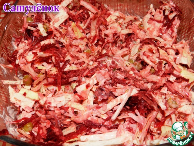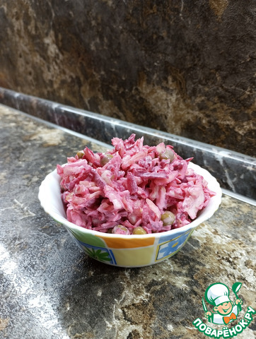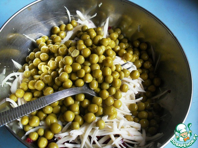 • Соединить свеклу, сыр с капустой, добавить горошек консервированный и все заправить майонезом.