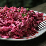 Светочка, очень заинтриговал салат, даже мИню - не любителя свеклы ... Интересно было попробовать сочетание свежей капусты и отварной свеклы... Копченого сыра не было. Добавляла уксус. Нам с мужем - понравилось, ему - хотелось еще более по-пикантнее, но это решаемо приправами...