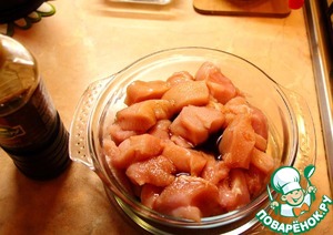 Мясо нарезаю, по возможности, брусками сечением 2-3 см., кладу в мисочку и добавляю ложку сахара, заливаю соевым соусом. В списке ингредиентов соли нет, а её и не будет. Соевый соус и так достаточно соленый.