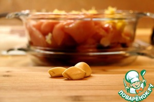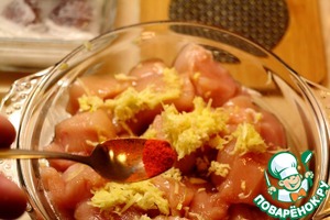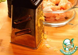 Имбирь потру на средней терке и к мясу его, вместе с волокнистой основой, которая не трется, и с соком, который остается на доске. Ничего не должно пропасть!!! Длина корешка примерно 3-4см.