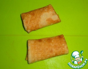 Яйца разболтать вилкой, посолить. Обмакнуть блины с начинкой в яйцо и поджарить на подсолнечном масле до золотистой корочки.
