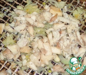 Отварное рыбное филе порезать маленькими кусочками и добавить к луку. Обжарить в течение 2 минут на среднем огне. Снять с огня.