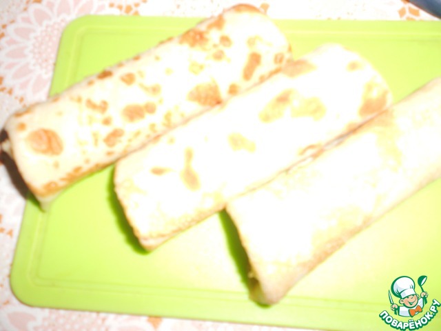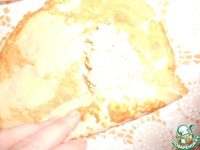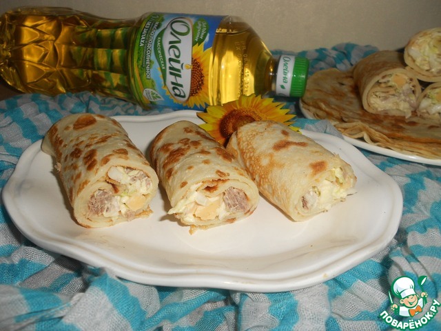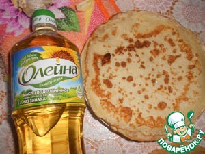 Приготовить блины по вашему любимому рецепту. Обжаривайте с обеих сторон на растительном масле "Олейна". На 2 порции понадобится 4 тонких блинчика.