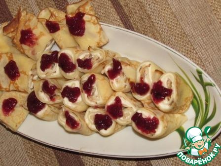 6. Сверните блинчик рулетом.. Полученные рулеты заверните в пищевую пленку и отправьте в холодильник на час.