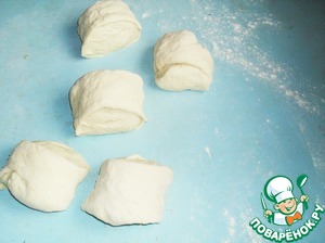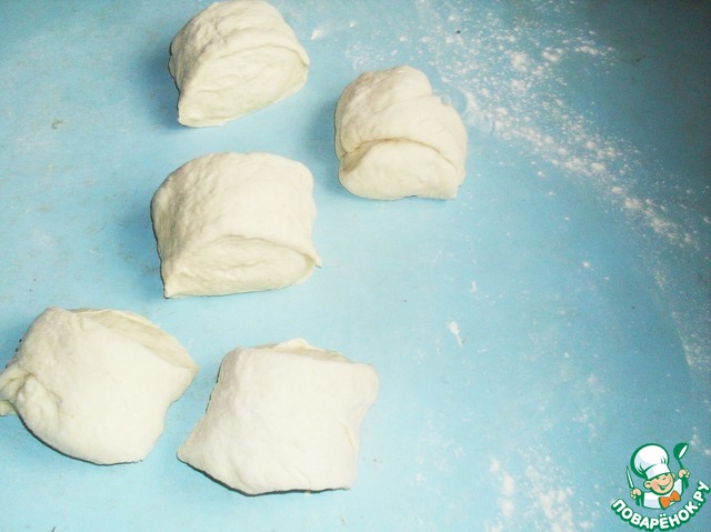 Тесто из холодильника достать, выложить на подпыленный мукой стол. Разделить на кусочки. Примерно по 50-60 грамм каждый.