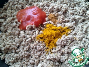 Когда жидкость частично выпарится, добавьте соль по вкусу, красный острый перец чили, куркуму и томатную пасту. -