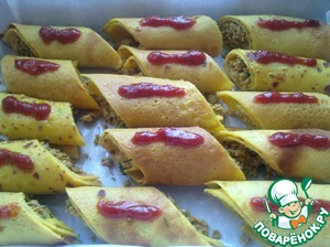 С каждого блина срезать концы при этом держать нож по диагонали и разрезать пополам. Из одного блина у вас получится два маленьких остроконечных блинчика. Заготовленные блинчики выложить на противень застеленный пергаментной бумагой. Каждый блинчик смазать томатным соусом или кетчупом.