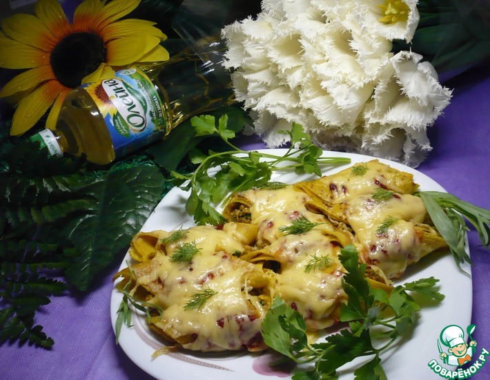Запекать блины в духовке 7 минут при температуре 180-200 градусов. Подавать блины горячими.