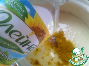 Для приготовления блинов в большую миску налить молоко и вбить яйца. Добавить соль, сахар, куркуму, муку и подсолнечное масло "Олейна".