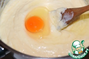 Дать крему слегка остыть и добавив по одному яйца, тщательно их вмешать.