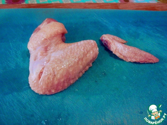 Куриные крылья хорошо помыть и обсушить бумажным полотенцем. Кончики крыльев отрезать и убрать. Сегодня они нам не понадобятся, но пригодятся, когда будем варить бульон :)